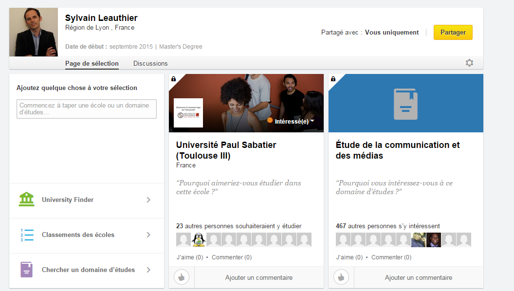 Pour la sélection d’université, LinkedIn va même jusqu’à donner la possibilité à l’utilisateur de sélectionner l’avancement de sa candidature (« Intéressé », « candidature envoyée », « accepté(e) », « y va »).