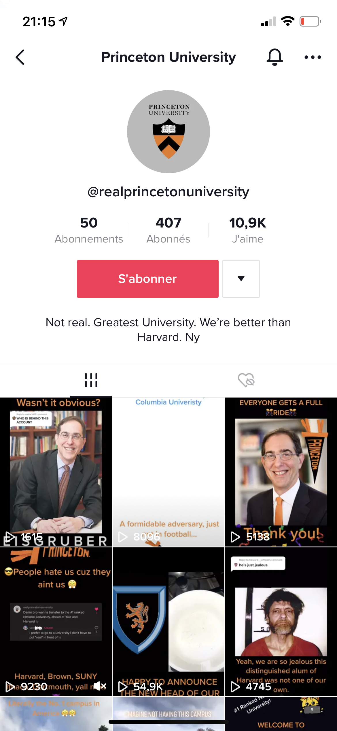 On pourrait croire que ce compte est le compte officiel de l’Université de Princeton, la bio nous indique vite que non !